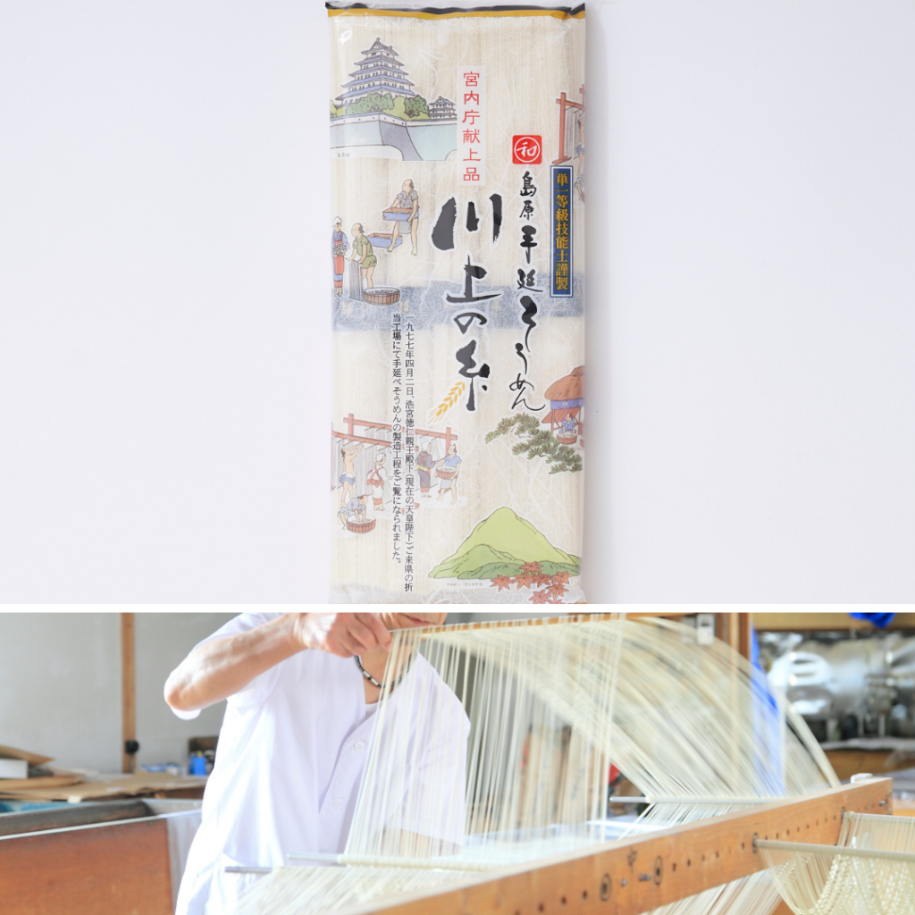 宮内庁献上品の手延べそうめんで、夏場は人気商品のため、例年1か月待ちになるほどの人気です。単一等級技能士が、伝統の技「手延べ製法」で30時間以上をかけて製麺しています。